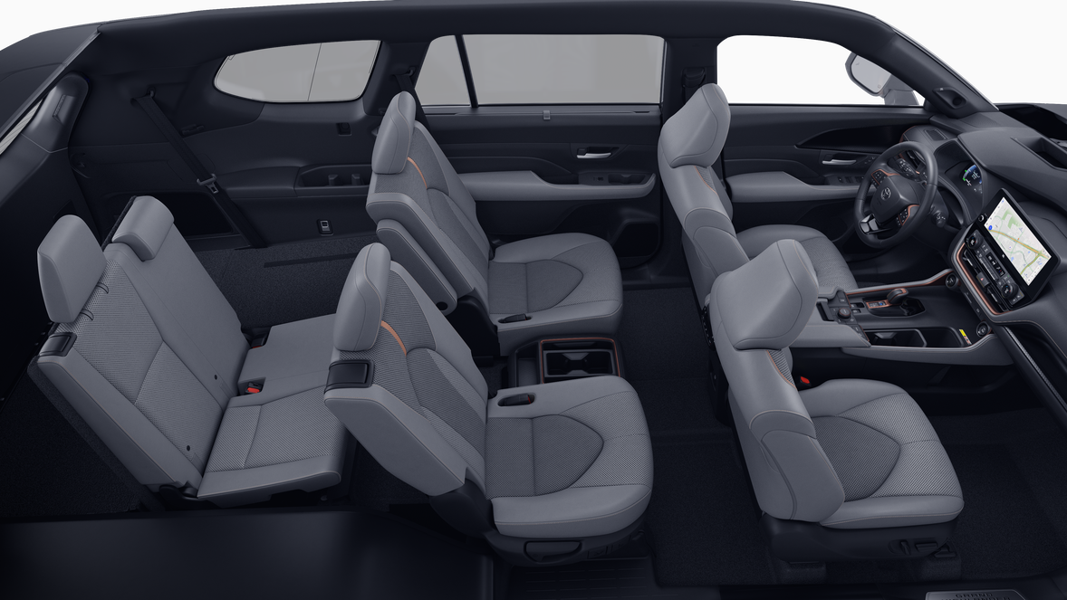 • 7-passenger seating with second-row fold-down captain's chairs and fold-down inboard armrests, adjustable headrests and two cup holders mounted on the floor; and 60/40 split, fold-down third-row seats with sliding headrests and recline function